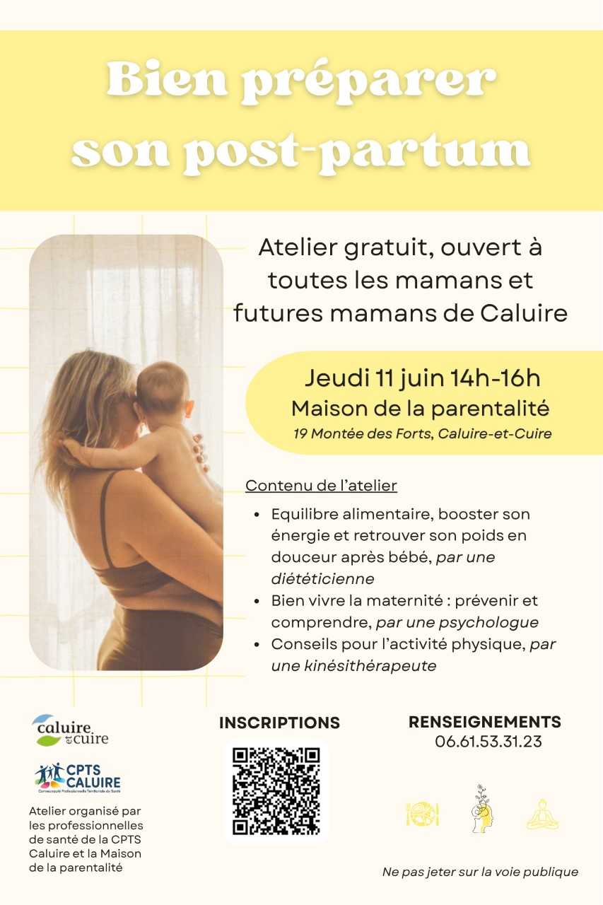 11/06/2026 - 14:00Ajouter au calendrieriCalendar Outlook Google Yahoo PARENTALITÉ Maison de la Parentalité, 19 Montée des Forts Atelier organisé par les professionnelles de santé de la CPTS Caluire et la Maison de la Parentalité. Inscription en cliquant ici Renseignements 06 61 53 31 23